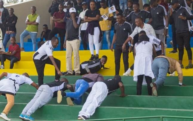 Abafana ba APR FC bagaragaye bari gutera pompages nyuma y’uko ikipe yabo yari imaze kunganya na Ivoire Olympics  yo mu kiciro cya kabiri.