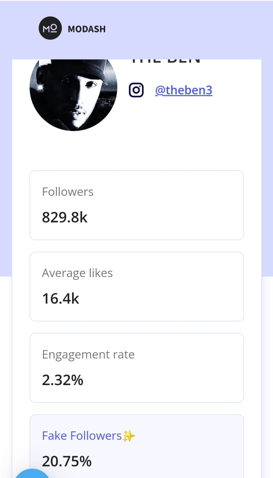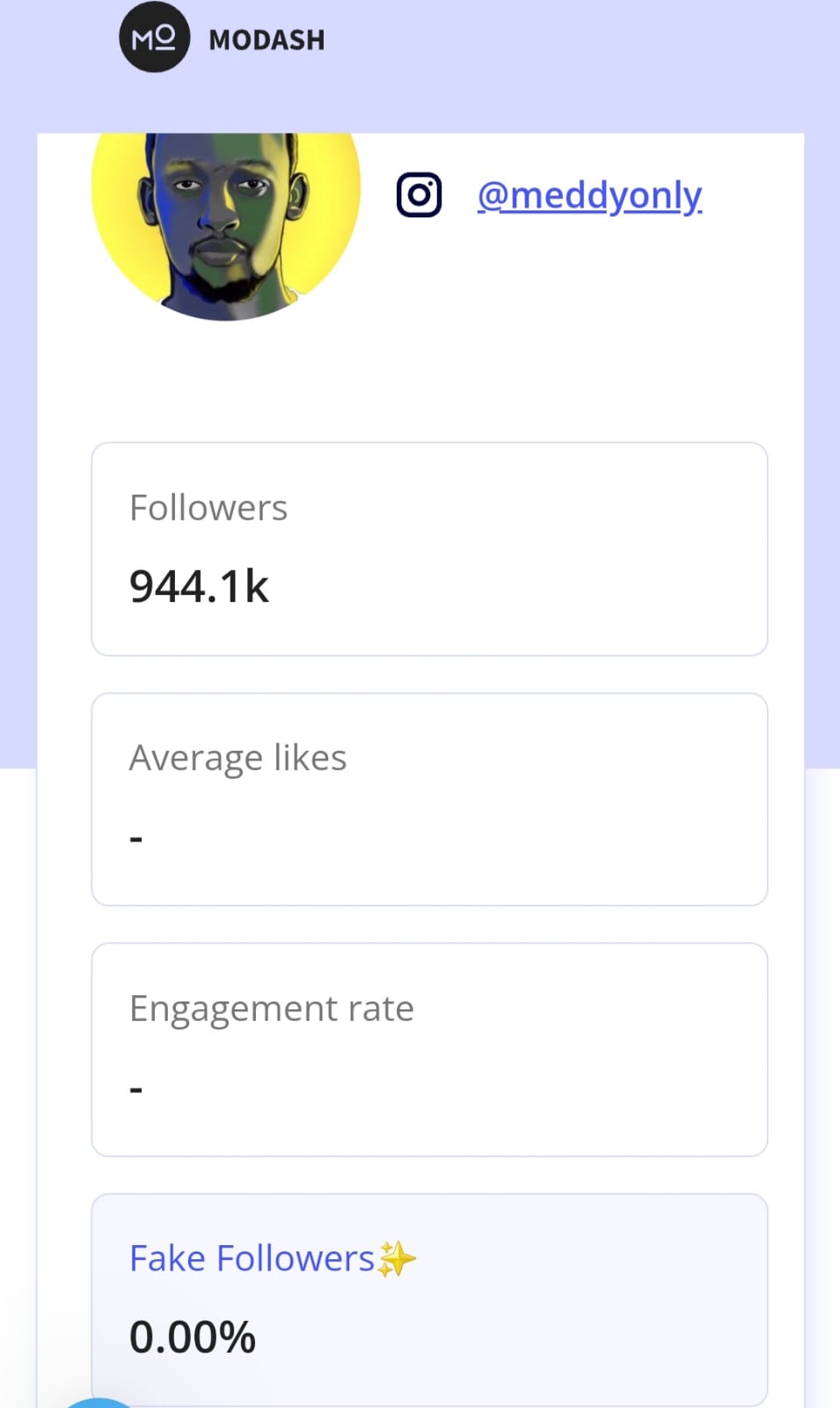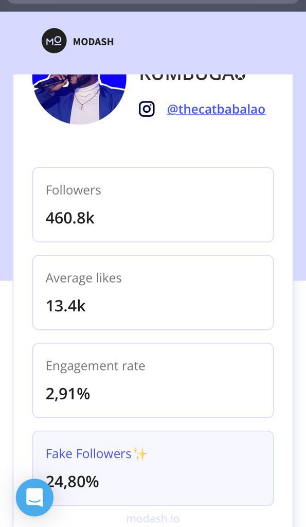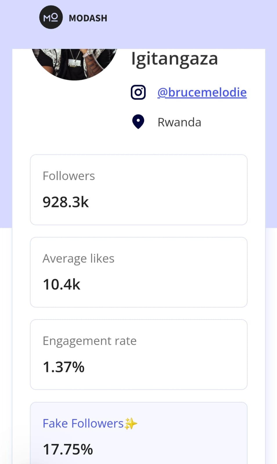 Muri aya mafoto agaragaza ibyo Modash yakoze, Meddy agaragara nkaho nta ba follower ba fake afite ariko nawe arabafite kuko ubusanzwe afite abantu 955 k ariko kuri raporo ya Modash igaragaza ko afite 944k.bivuze ngo abarenze ho ni ibihuha.