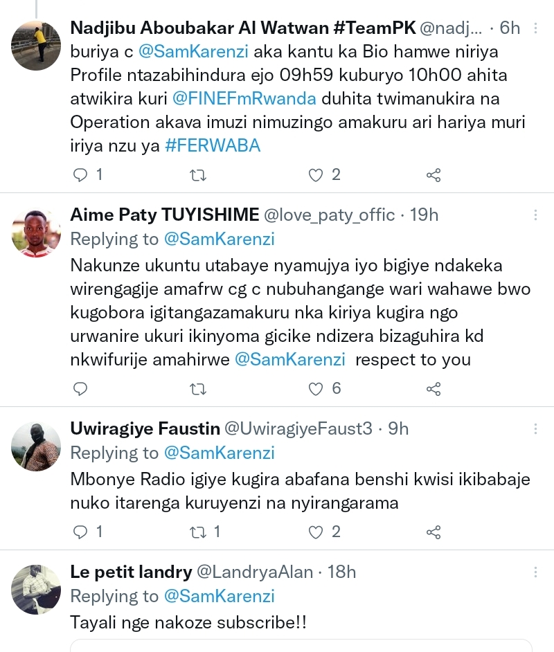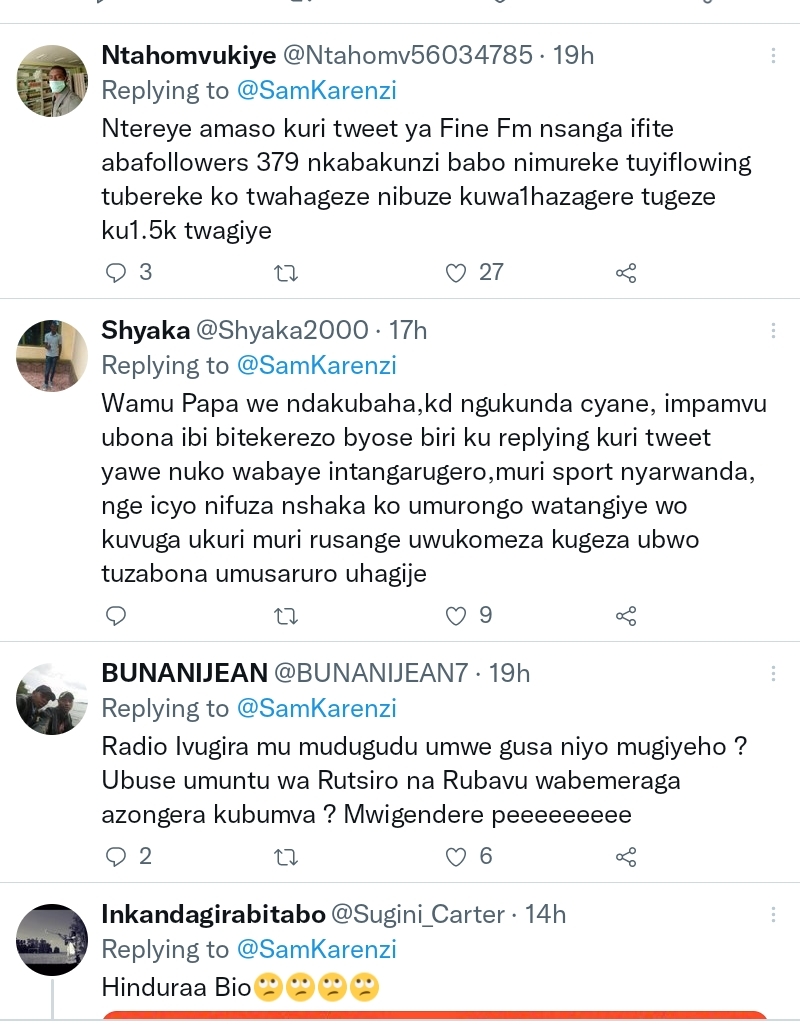 Umunyamakuru w’imikino ukunzwe mu gihugu, Sam Karenzi uherutse gusezera kuri Radio 10 yari abereye umuyobozi yashimishije abafana be ubwo yabararikiraga ikiganiro gishya kuri radio agiye gukoraho ya Fine FM.