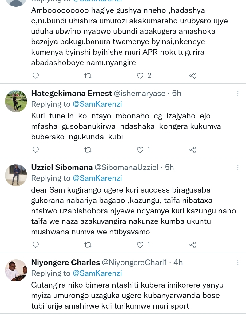 Sam Karenzi ni umwe mu banyamakuru b’imikino bakomeye mu Rwanda, benshi banyurwa n’ubusesenguzi bwe ahanini kubera kudaca ibintu k’uruhande.Kuri ubu agiye gutangira ikiganiro gishya kuri uyu wa mbere nk’uko yabitangaje kuri Twitter.