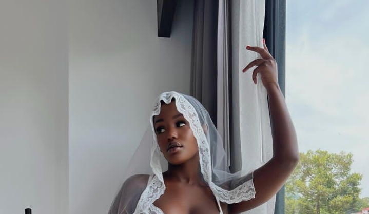 Muri iyi foto yari yambaye akenda k’umweru kabonerana ndetse n’igice cyo hasi yagisohoye.