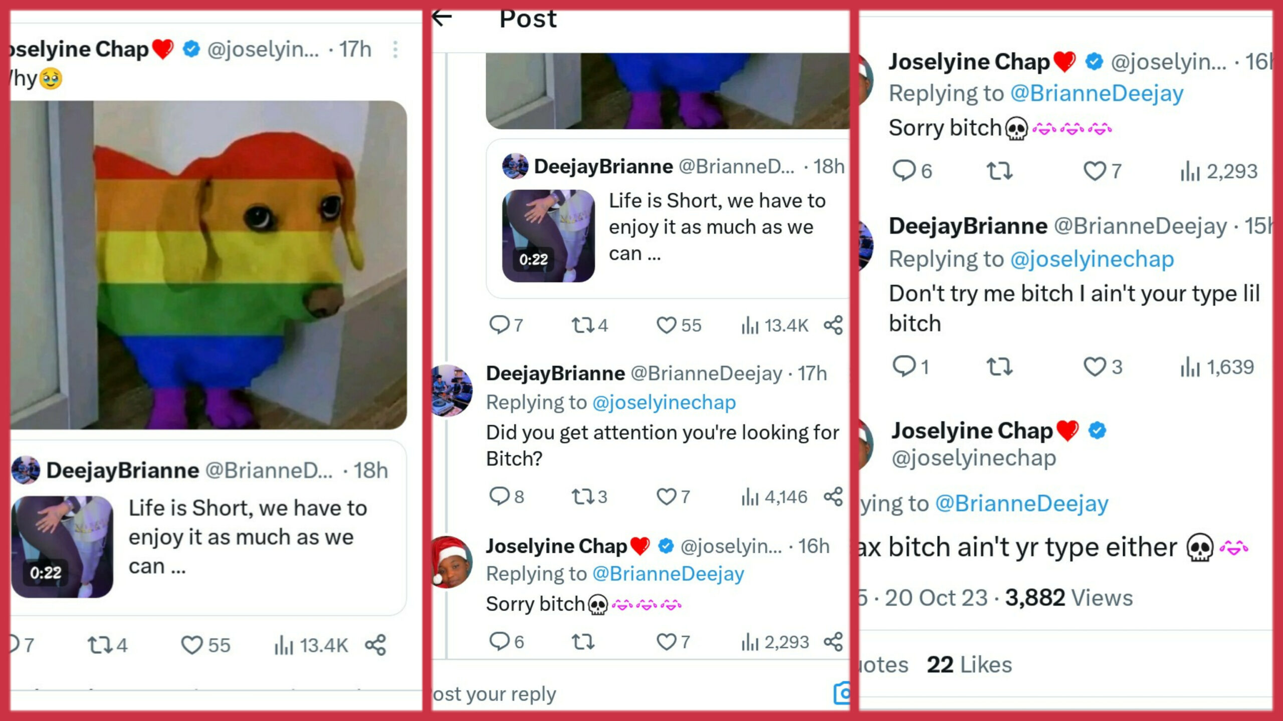 Nibwo umwe mu bakobwa bakoresha X yahise aza akubitamo imbwa isa nk’idarapo ry’abatinganyi, ubundi intambara iba ije gutyo, aba bombi batukanye ibitutsi bikomeye utatinyuka gusubiramo. Ntiwabishyira no mu kinyarwanda.