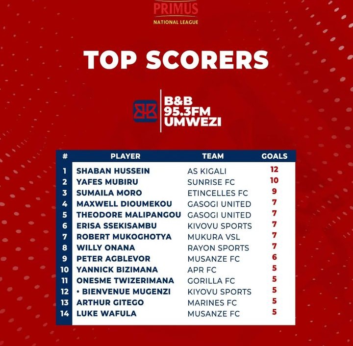 Nyuma y’umunsi wa 18 wa shampiyona y’umupira w’amaguru mu Rwanda mu bagabo rutahizamu wa As Kigali Shaban Hussein niwe uyoboye abandi mu bamaze gutsinda ibitego byinshi kuko amaze gutsinda ibitego 12.