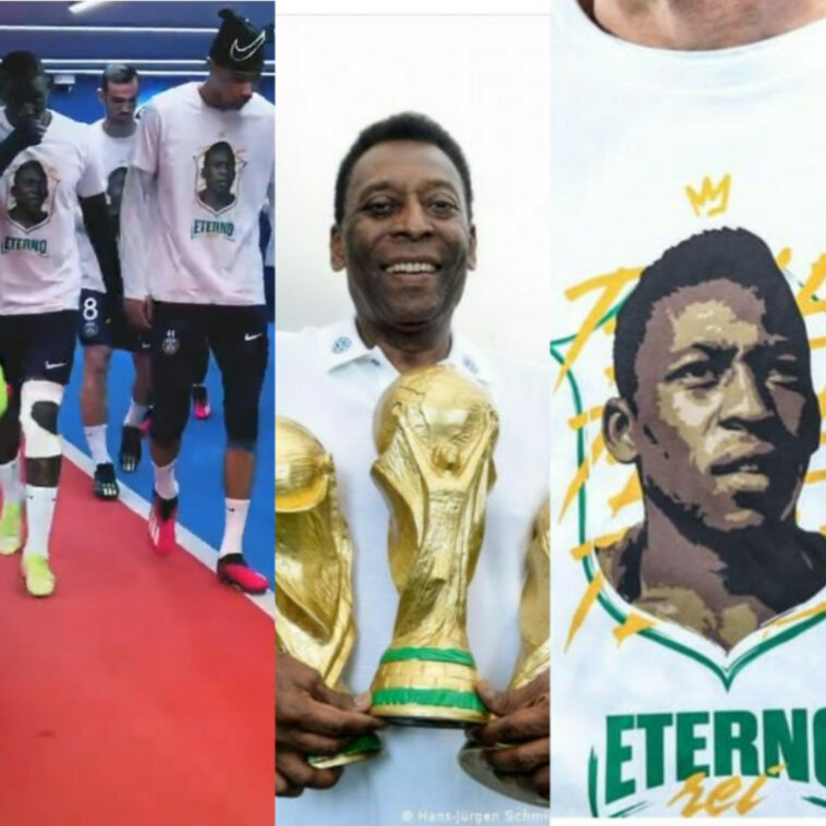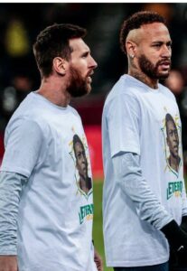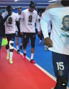 Kuri uyu wa gatatu nibwo hagaragaye abakinnyi bi kipe ya PSG basohoka m’urwambariro bajya kwishyushya mbere y’umukino, bambaye imipira iriho ifoto ya pele.