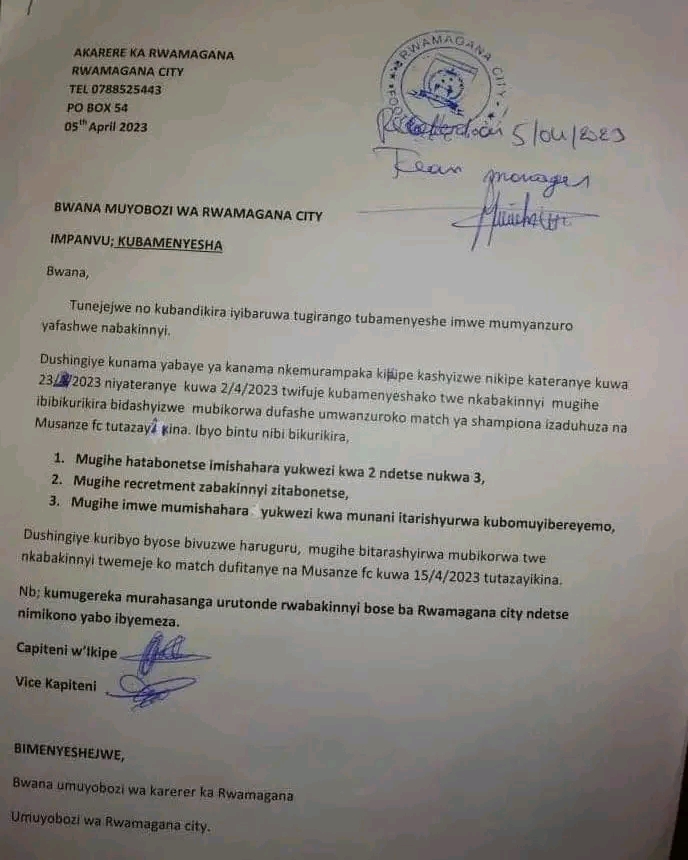 Mu ibaruwa ndende yasinyweho n’abakinnyi ba Rwamagana City banditse basaba ubuyobozi ko niba itabishyuye amafaranga y’imishahara y’ujwezi kwa Kabiri n’ukwa Gatatu batazigera bongera kugararagara mu mirimo y’ikipe.