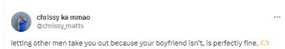 Yifashishije urubuga rwa twitter Chrissy Matts yagize ati:” Kwemerera undi musore ko agusohokana mu gihe umukunzi wawe atabikoze ni byiza cyane rwose”