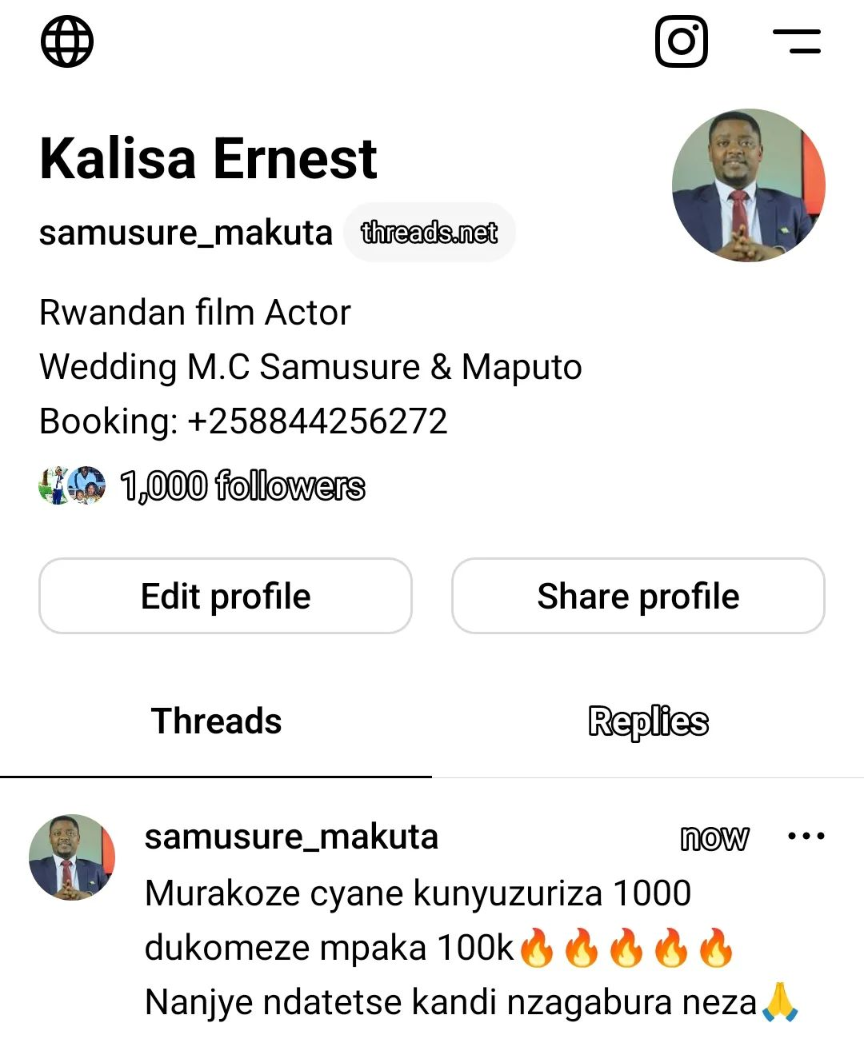 Samusure yujuje abantu igihumbi bamukurikira ku rubuga rwa Threads maze ashimira abakunzi be agira ati:” Murakoze cyane kunyuzuriza 1000 dukomeze mpaka 100k nange ndatetse kandi nzabagaburira”.