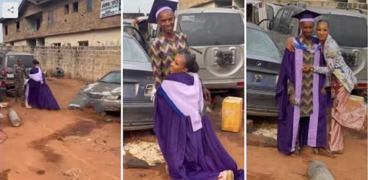 Icyakurikiyeho nuko bombi bifotozanyije, ni nyuma yaho umukonwa yambitse papa we imyenda bambara iyo barangije amashuri.