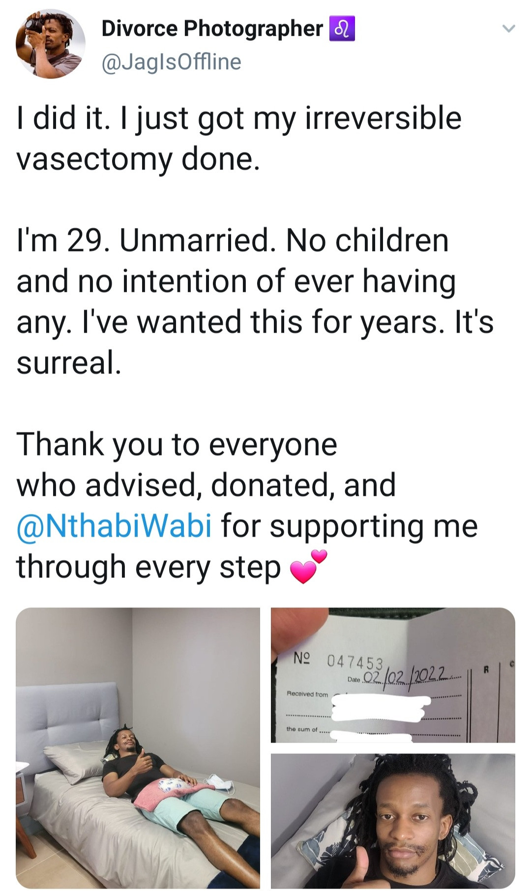 Abakoresha imbuga nkoranyambaga batunguwe n’umugabo wimyaka 29 wahisemo kwifungisha burundu avuga ko adashaka kuzagira abana mu buzima bwe.Uyu mugabo bivugwa ko yatandukanye n’umugore we batabyaranye yashyize kuri twitter icyemezo kugaragaza ko yamaze kwifungisha burundu (vasectomy)ndetse ko bimunejeje cyane kuko nta mwana akeneye.
