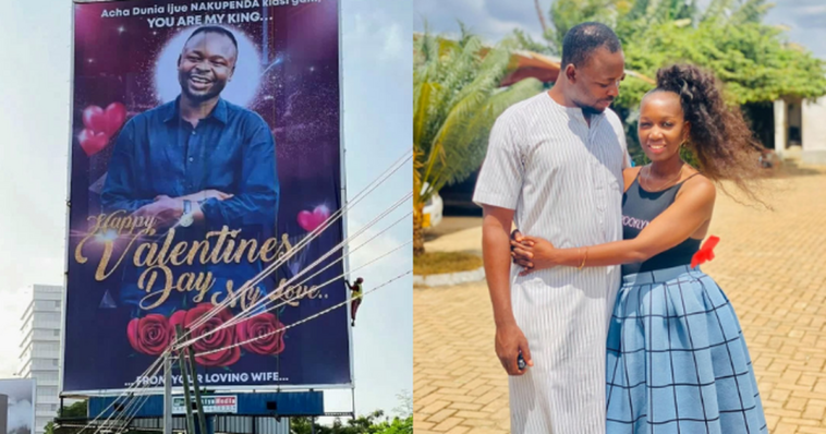 Abantu batunguwe n’umunyamakurukazi washyize umugabo we ku cyapa ku munsi w’urukundo