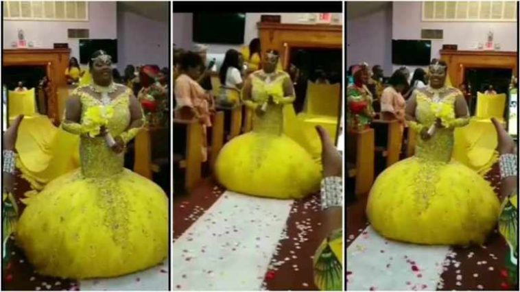 Umugeni yatunguye abantu batari bake ubwo yambaraga ikanzu ikoze mu buryo budasanzwe. Mu gihe abageni bambara imyambaro y’umweru , uyu yagaragaye yambaye ikanzu y’umuhondo ariko nayo ikoze mu buryo busekeje cyane.