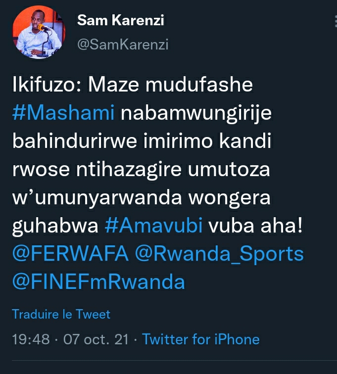 Sam Karenzi abinyujije ku rukuta rwe rwa Twitter yanditse amagambo akurikira « Ikifuzo: Maze mudufashe #Mashami nabamwungirije bahindurirwe imirimo kandi rwose ntihazagire umutoza w’umunyarwanda wongera guhabwa #Amavubi vuba aha! @FERWAFA @Rwanda_Sports @FINEFmRwanda ».