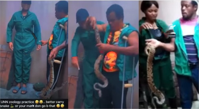 Mu mashusho yagaragaye ku mbugankoranyambaga abanyeshuri b’abakobwa bari kumwe n’umwarimu wabo w’umugabo abihisha uko bafata inzoka.Aba bana b’abakobwa bivugwa ko biga muri kaminuza bari bafite ubwoba ,batinya ibi bikoko.Uyu mugabo yabasabaga ko bagenda bagafata inzoka bakazifashisha mu isomo ry’ibinyabuzima.