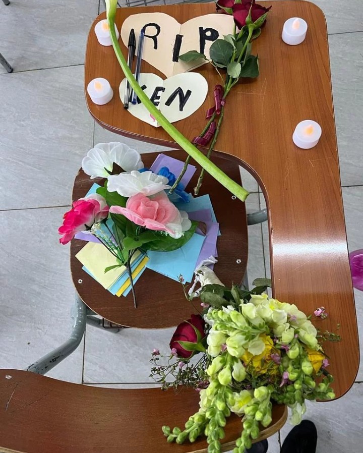 Byabaye ku munsi uyu nyakwigendera yari gusezererwaho, ubwo abana bigana n’uyu nyakwigendera bashyize indabyo ku ntebe yicarwagaho maze bandika ho amagambo agira ati “Ruhukira mu mahoro(RIP).