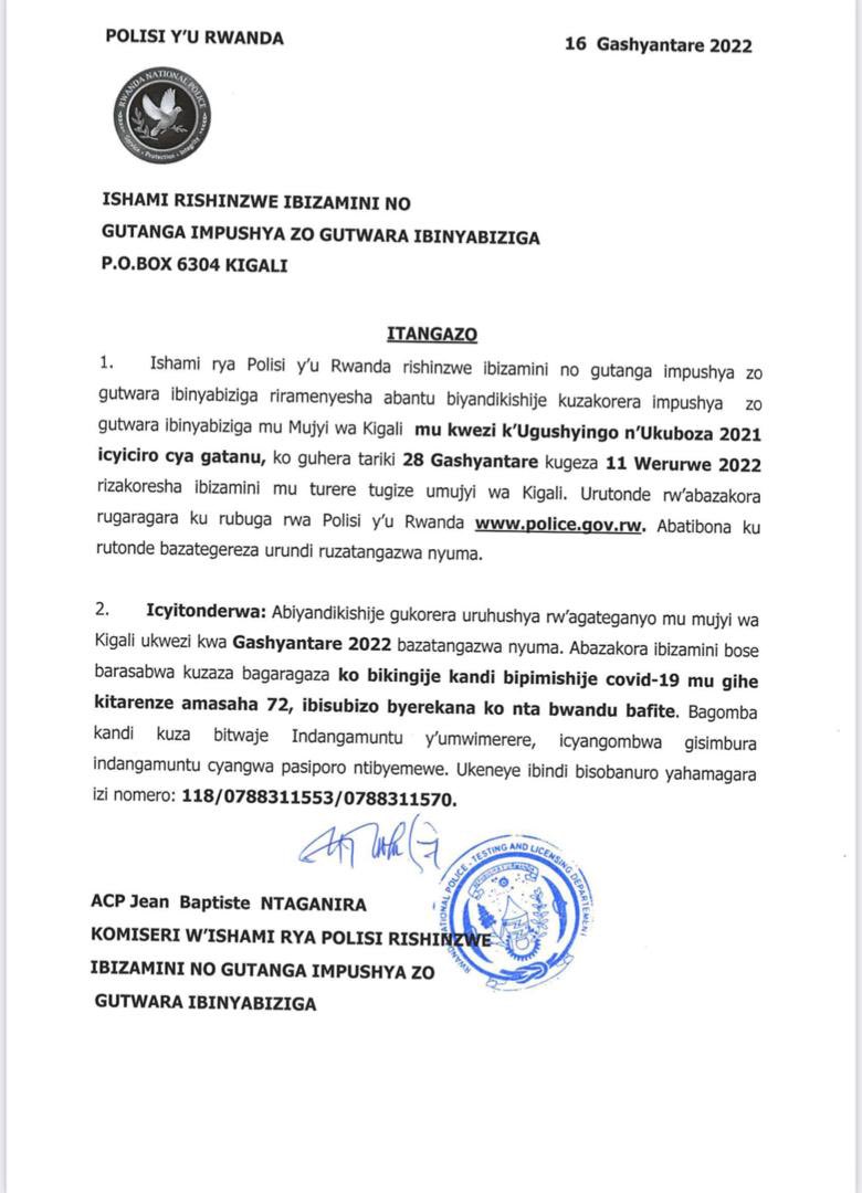 Nkuko bigaragara kuri iri tangazo, abanyeshuri biyandikishije gukorera impushya zo gutwara ibinyabiziga mu mujyi wa Kigali mu kwezi kw’Ugushyingo ikiciro cya Gatanu bazatangira gukora ibizamini guhera ku ya 28 Gashyantare 2022 kugeza ku ya 11 Werurwe 2022.