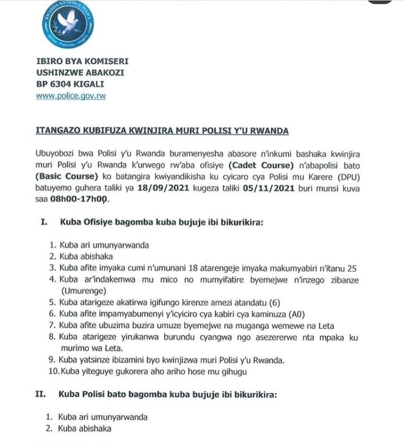 Polisi y’u Rwanda imaze gushyira hanze itangazo rihamagarira abasore n’inkumi bifuza kwinjira muri Polisi ku rwego rw’aba ofisiye (Cadet course) n’Abapolisi bato(Basic course)