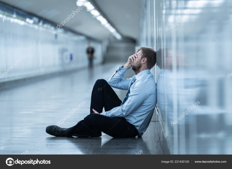 Young jobless business man suffering depression sitting on ground street underground leaning on wall alone looking desperate in Emotional pain Mental health Unemployment and Human emotions concept.