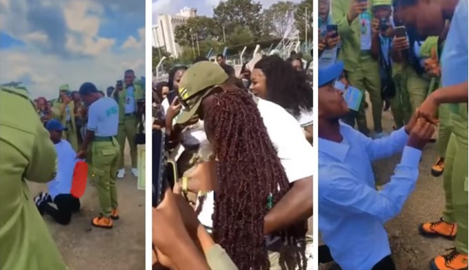 Muri videwo yasakaye kuri instagram, igaragaza aba basirikare babiri batera ivi imbere y’abasikarekazi babasaba ko bakwemera bakazabana ubuziraherezo.