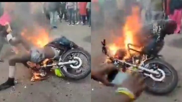 Ni amashusho agaragara aba bajura bafashwe bari gutwikirwa kuri moto aho barwanaga no guhunga umuriro, ariko abaturage bari babakikije, bakabasunikira mu muriro kugira ngo bashye bumva.