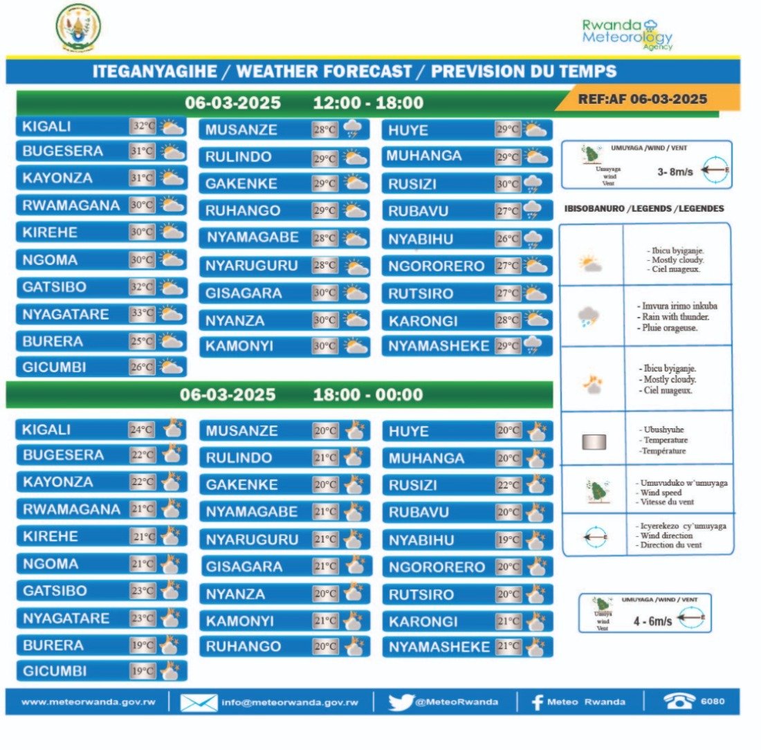 Ikigo cy’Igihugu gishinzwe iteganyagihe cy’u Rwanda ‘Meteo Rwanda’ cyatangaje ko kuri uyu wa Kane tariki 06 Werurwe 2025 hagati ya saa 12:00 na18:00 hateganyijwe: