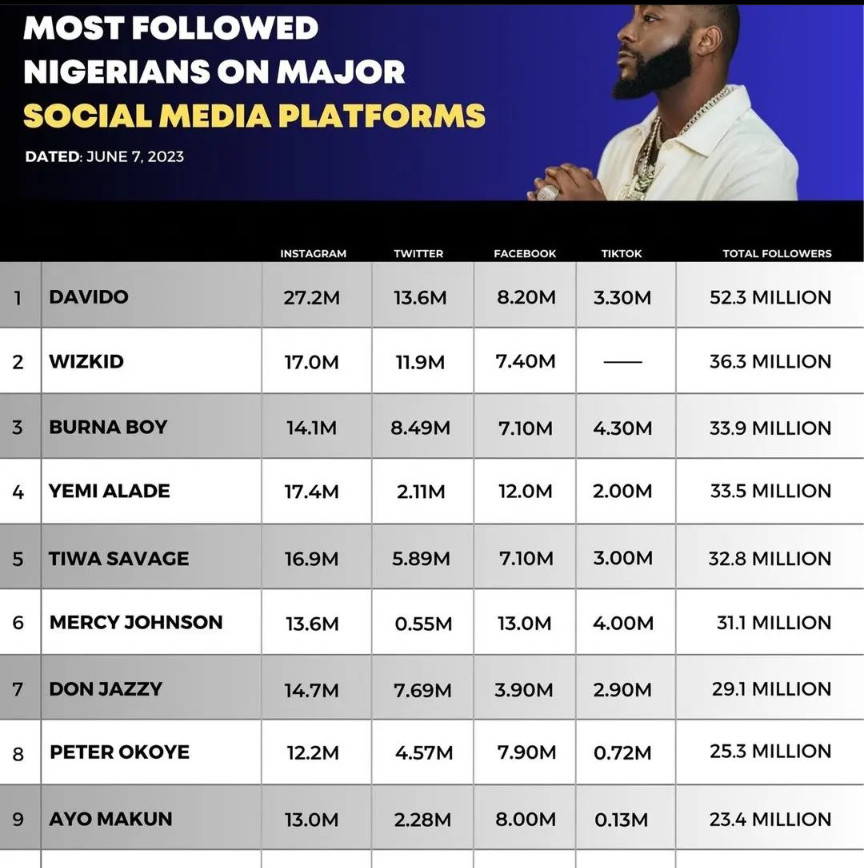 Davido niwe muhanzi wa mbere wo muri Nigeria ukurikwa cyane ku mbuga nkoranyambaga kurusha abandi bose dore ko haba Burna Boy ndetse na Wizkid nabo bari kwisonga muri iki gihugu nta numwe umurusha gukurikirwa cyane kuri social media.