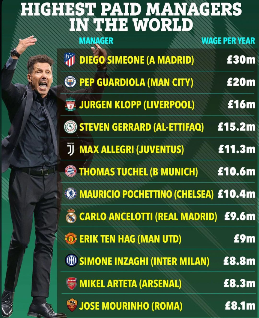 Hagaragaye urutonde rw’abatoza 10 bayoboye abandi muguhembwa agatubutse ruyobowe na Diego Someone utoza ikipe ya Atlético de Madrid yo mu gihugu cya Espane akaba arushwa ibigwi na bamwe mubatoza ayoboye.