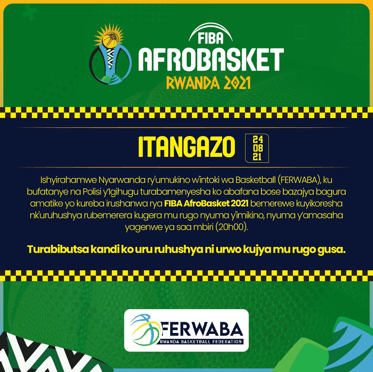 Kuri uyu wa Kabiri tariki 24 Kamana 2021 nibwo hatangira imikino ya Afrobasket ibera muri Kigali Arena. Kubera ko hari umukino uri burangire nyuma ya saa mbiri z’ijoro hakaba hari n’undi uri butangire nyuma ya saa mbiri z’ijoro, FERWABA ku bufatanye na Polisi y’U Rwanda bemereye abari bube barebye iyi mikino ko bataha nyuma y’amasaha yagenwe yo gutaha ariyo saa mbiri z’ijoro ariko bakerekana iticye baraba binjiriyeho ubwo barebaga imikino ya Afrobasket kugirango koko bemeze ko bari barimo kureba iyi mikino. Ibi ni bimwe mu bikubiye mu itangazo rikurikira FERWABA yashyize hanze ibinyujije ku rukuta rwayo rwa Twitter.