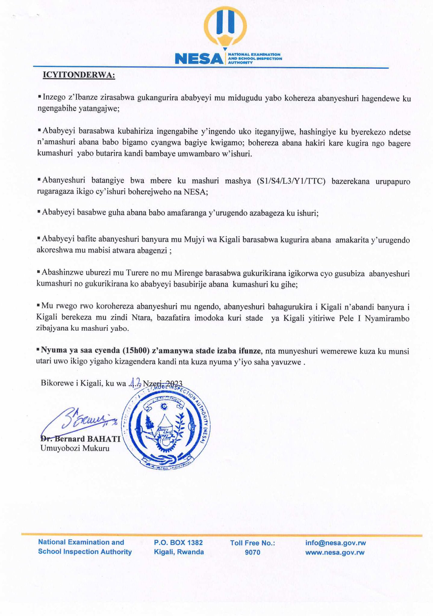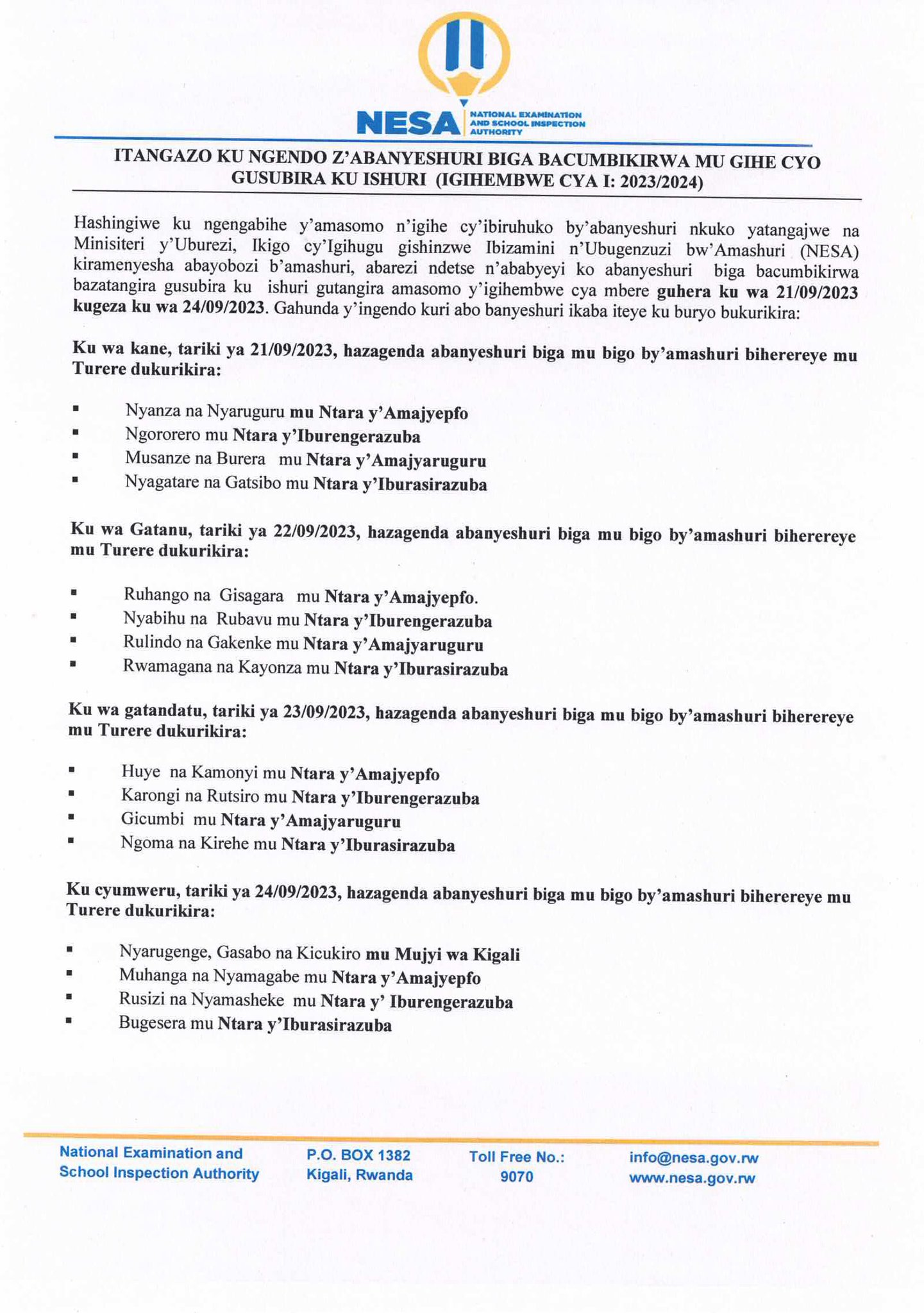 Abanyeshuri ba mbere bazatangira ku genda tariki 21 Nzeri 2023 mu gihe abanyuma bazagenda tariki 24 Nzeri 2023.