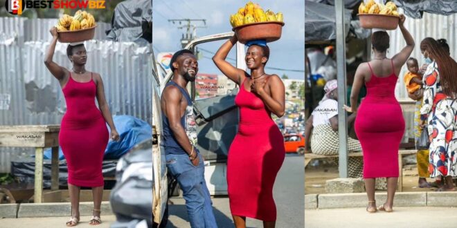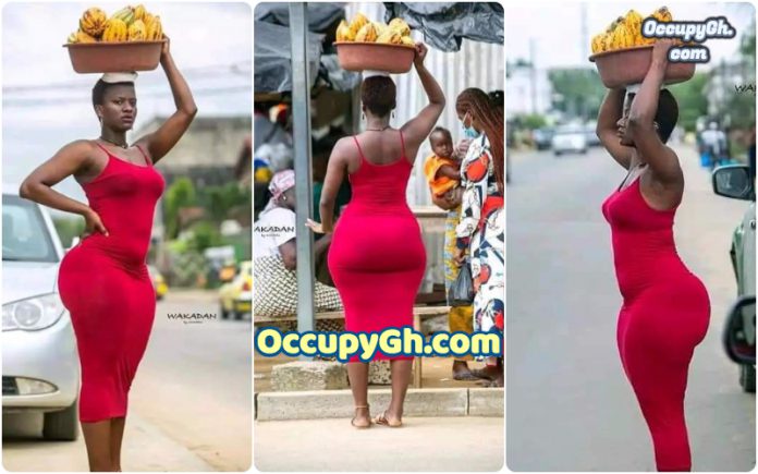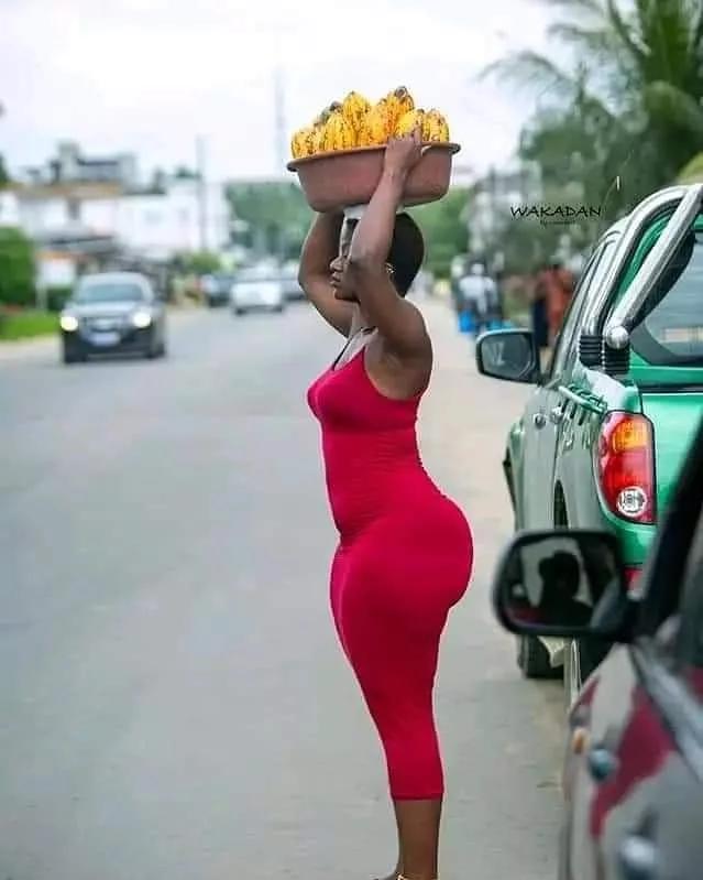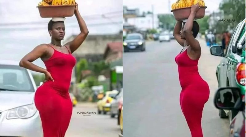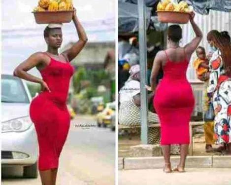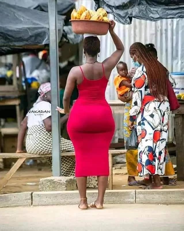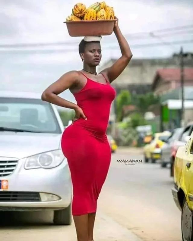 Amafoto y’uyu mwari wo muri Côte d’Ivoire yagiye hanze, amugaragaza yikoreye amapapayi ku rutaro yambaye ikanzu itukura igaragaza imiterere y’igice cye cyo hasi, ibyatumye abagabo benshi bacika ururondogoro batangarira amabuno ye.