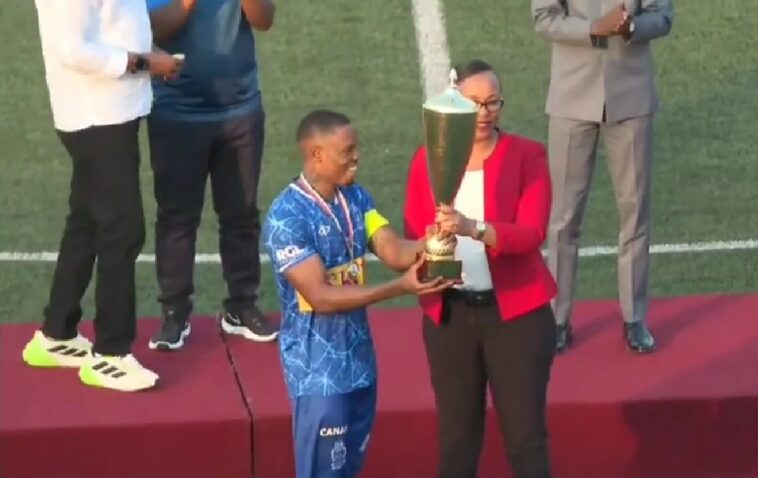 Nyuma y’umukino Minisitiri wa Siporo ni we watanze igikombe aho yagishyikirize Kapiteni wa Rayon Sports, Rwatubyaye Abdul.