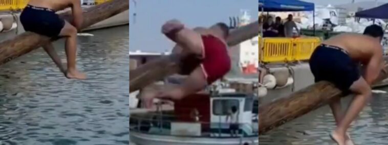 Mu mashusho yagaragaye ku mbuga nkoranyambaga yagaragaje abantu bari mu marushanwa yo kunyura ku giti kinyerera cyane kugira ngo bagere kuka darapo kari ku mpera z’icyo giti aho bamwe mu bagabo bahuraga n’ingorane zo gukubita imyanya y’ibanga ku giti.