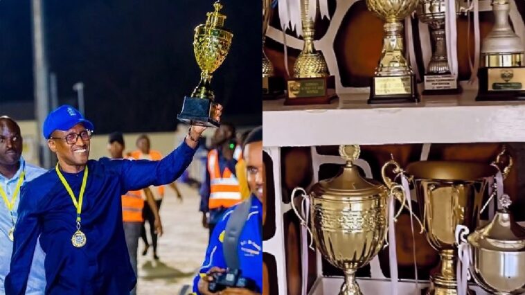 Akabati kuzuye ibikombe! Nyuma yo gutaha ibiro bishya, Rayon Sports yamuritse umurundo w’ibikombe imaze kwibikaho (VIDEWO)