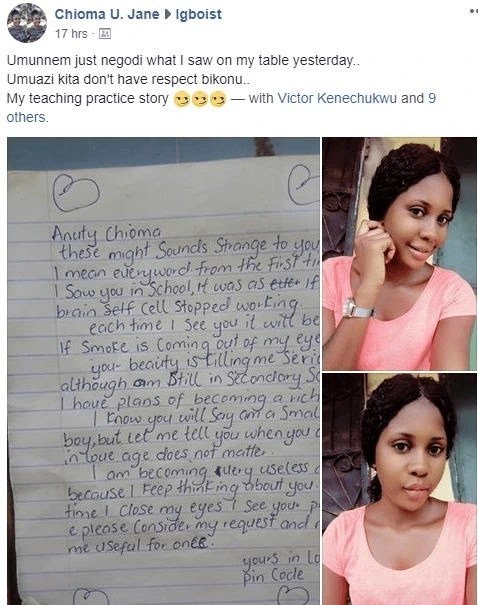 Uyu mwalimu witwa Chioma Jane, wigisha uyu musore utatangajwe amazina ye muri segonderi, yashyize ahagaragara ibaruwa yandikiwe n’uwo munyeshuri amusaba ko yamubera umukunzi.