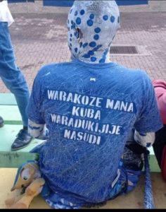 Uyu mufana yagaragaye rero yiyanditseho mu mugongo amagambo agira Ati”Warakoze Mana kuba waradukijije Masudi”.