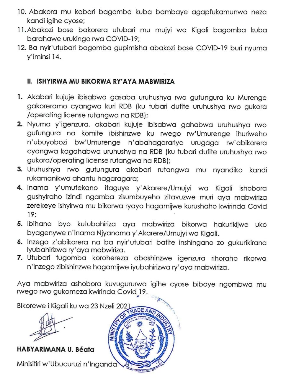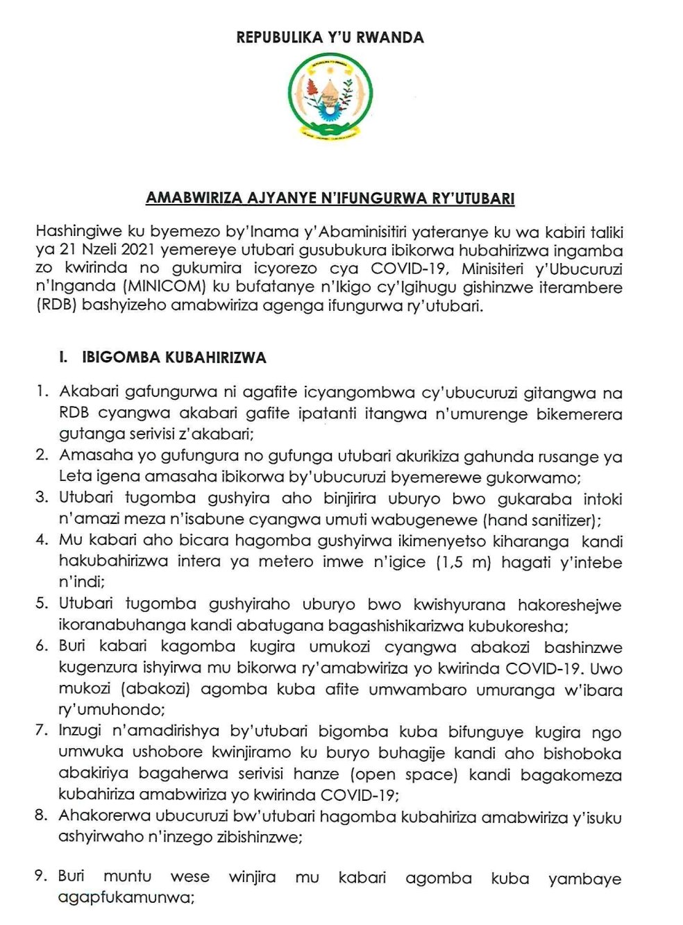Nyuma yuko inama y’Abaminisitiri yateranye ku wa 21 Nzeri 2021 yanzuye ingingo zirimo n’imwe ijyanye nuko utubari tuzafungura mu byiciro kuri ubu Minisiteri y’Ubucuruzi n’inganda mu Rwanda, yashyize ahagaragara amabwiriza akurikira ajyanye n’uko utubari tuzafungura.