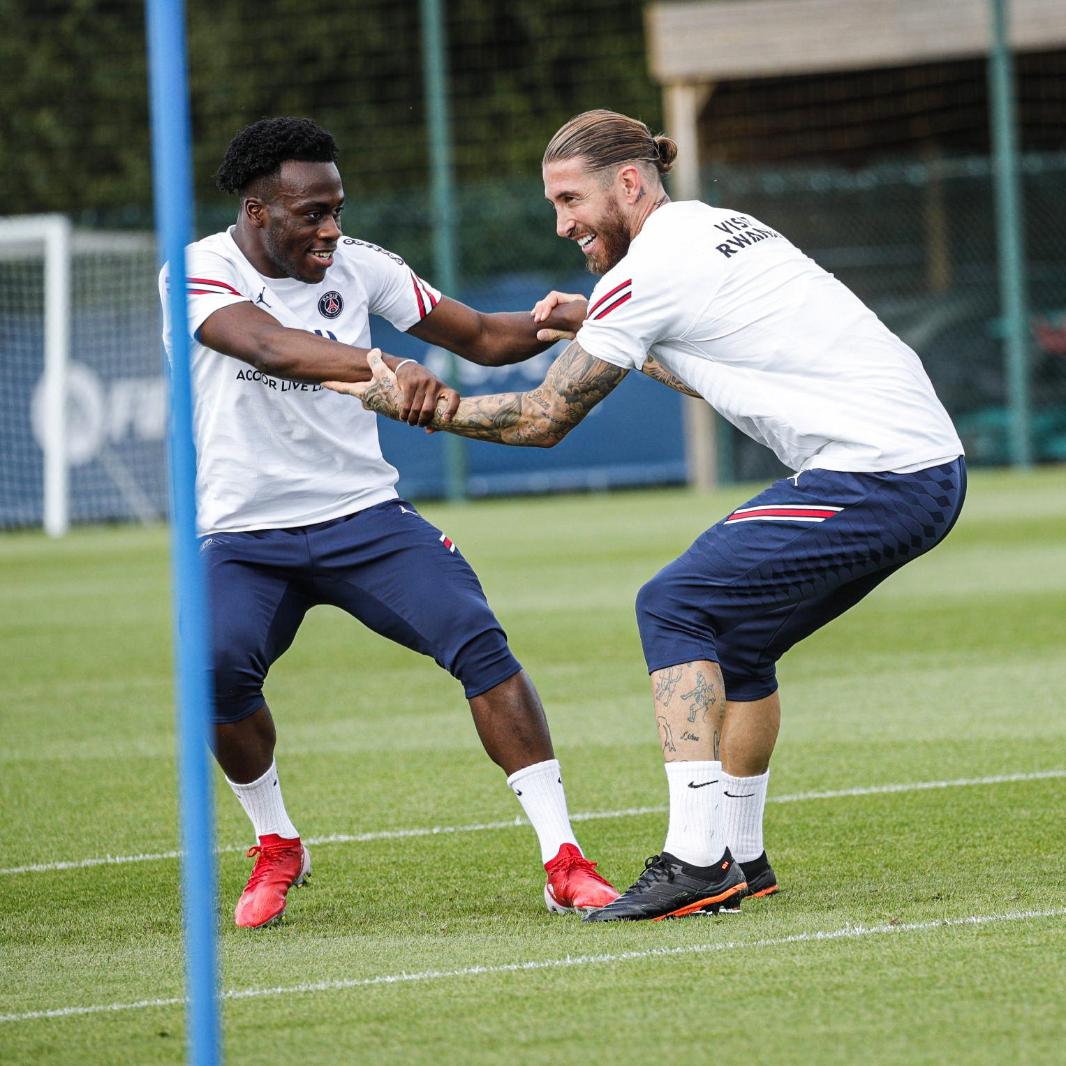 Sergio Ramos uherutse gusinyira ikipe ya Paris Saint-Germain amasezerano y’imyaka 2 yagaragaye ari mu myitozo ndetse ari kumwe na bagenzi be aho yari yambaye imyenda y’imyitozo ya PSG yanditseho Visit Rwanda mu mugongo.