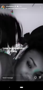 Shaddyboo abinyujije kuri Instagram ahashyirwa ubutumwa bw’amasaha 24 (story), yagaragaye yishimye cyane ibitwenge ari byose ari ko akorakora mu mutwe umukunzi we Manzi uherutse no kumwereka umuryango.