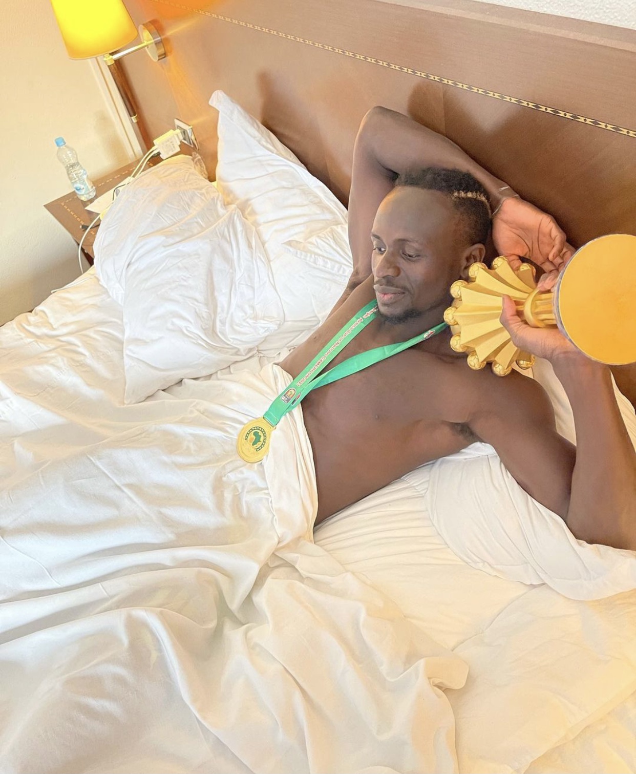 Mu gitondo cyo kuri uyu wa mbere tariki ya 07 Gashyantare 2022, Sadio Mané abinyujije ku rukuta rwe rwa instagram yashyize hanze amafoto aho yarari mu buriri apfumbase igikombe cya AFCON 2021 maze ayaherekesha amagambo agira ati « Alhamdoulilah ».