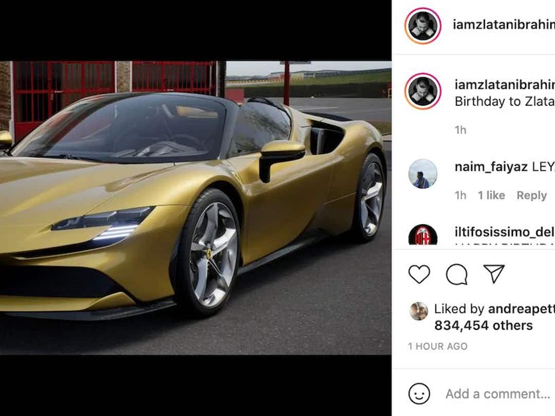 Zlatan yatanze ibihumbi 400.000 by’amapawundi kuri Ferrari Sf90 Stradale iri mu zihenze kandi zigezweho ku Isi. Iyi ikaba ari yo modoka ya mbere ikoresha amashanyarazi kandi ishobora gukoresha umuvuduko wo hejuru ugera kuri 211mph.
