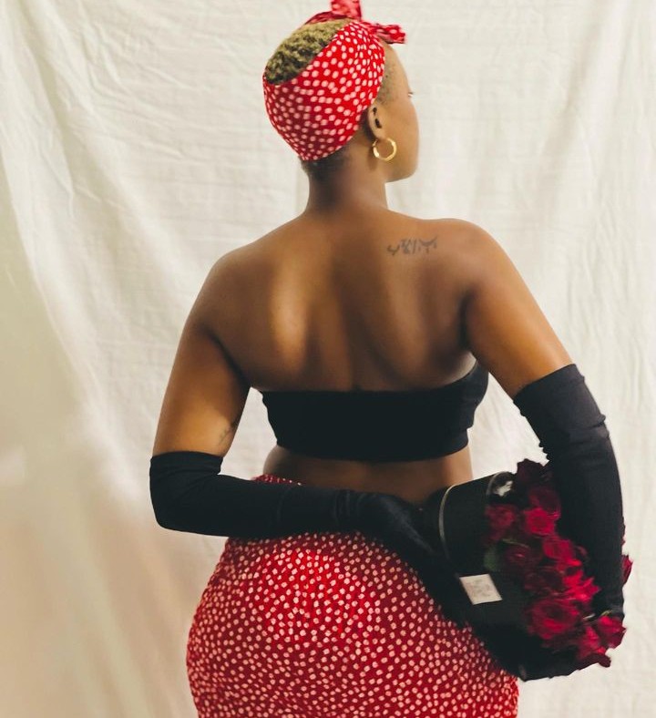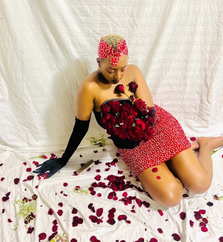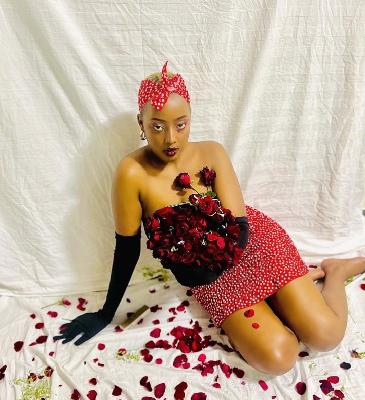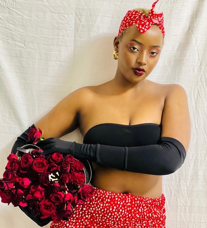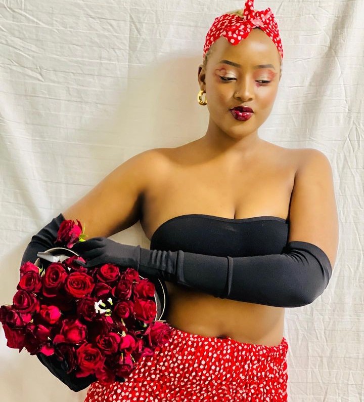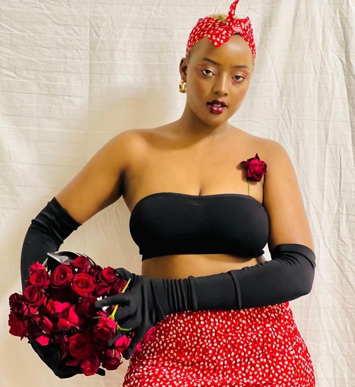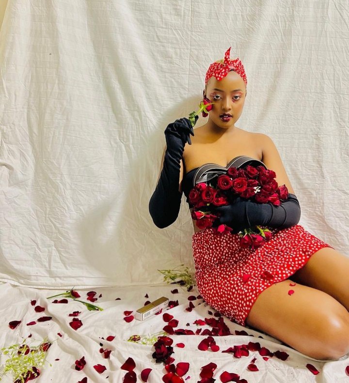 Ni mu mafoto agaragaza bimwe mu bimenyetso bya St Valantin nk’uko benshi bamaze kumenyera ko ahari indabo n’ibara ry’umutuku n’umukara biba bisobanuye umunsi w’abakundana uzwi nka St Valantin, kandi akaba ari yo manaraba asangwa mu mafoto y’uyu mukobwa.