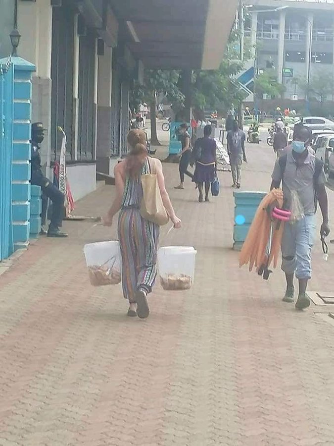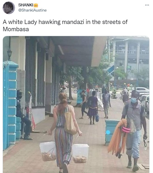 Amafoto y’umugore w’umuzungu yakwirakwiriye hirya no hino ku mbuga nkoranyambaga no mu binyamakuru bitandukanye, berekana ko ubuzima bushobora kuba butoroshye ku muzungukazi agahitamo kuzunguza ku muhanda wa Mombasa, amandazi Capati n’imikati.