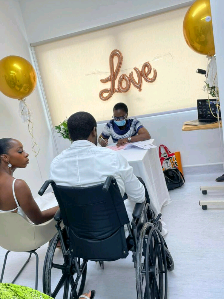 Mu mafoto yasakaye ku mbuga nkoranyambaga ,agaragaza uyu mugabo yicaye mu kagare n’umugore we amwicaye iruhande ndetse n’indi bicaye ku gitanda cyo kwa muganga, aho abantu benshi banyuzwe n’urukundo rwabo ndetse babifuriza kuzarambana.