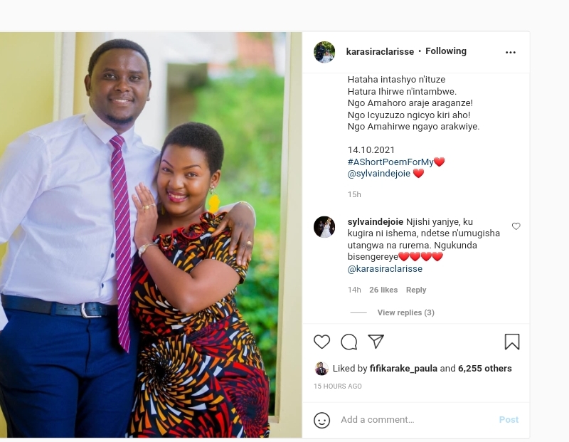 Clarisse Karasira yanyarukiye kuri instagram maze yandikaho amagambo meza akoze nk’umuvugo ayatura umugabo we, nyuma y’ifoto yabo bombi yari amaze gushyiraho.