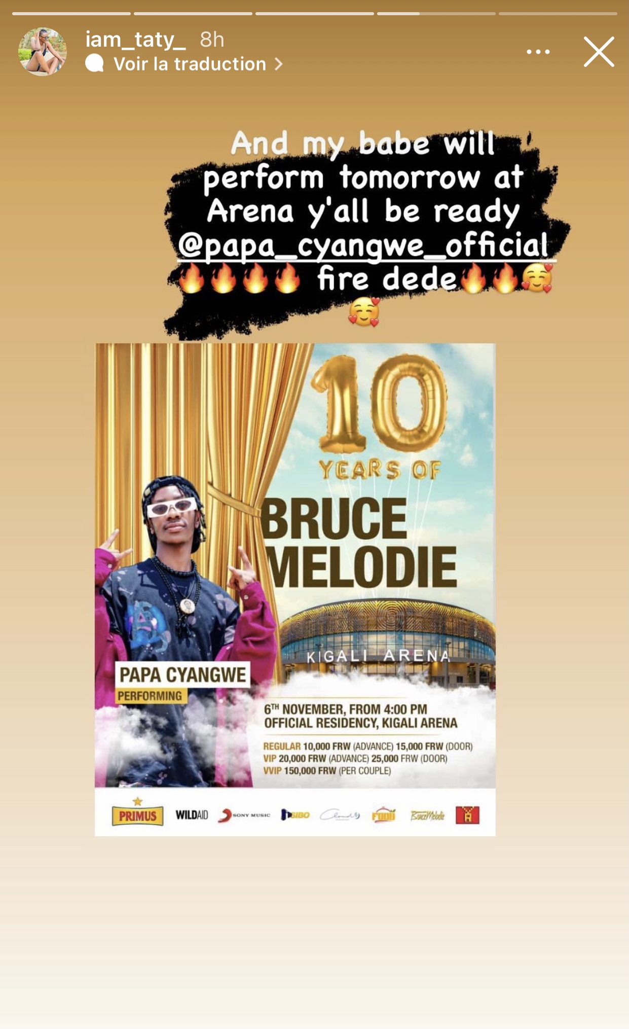 Mu gihe habura amasaha make kugirango Papa Cyangwe aririmbe mu gitaramo cya 10 years anniversary of Bruce Melodie, umukunzi we Mama Cyangwe abinyujije kuri story ya instagram ye yamugeneye ubutumwa.