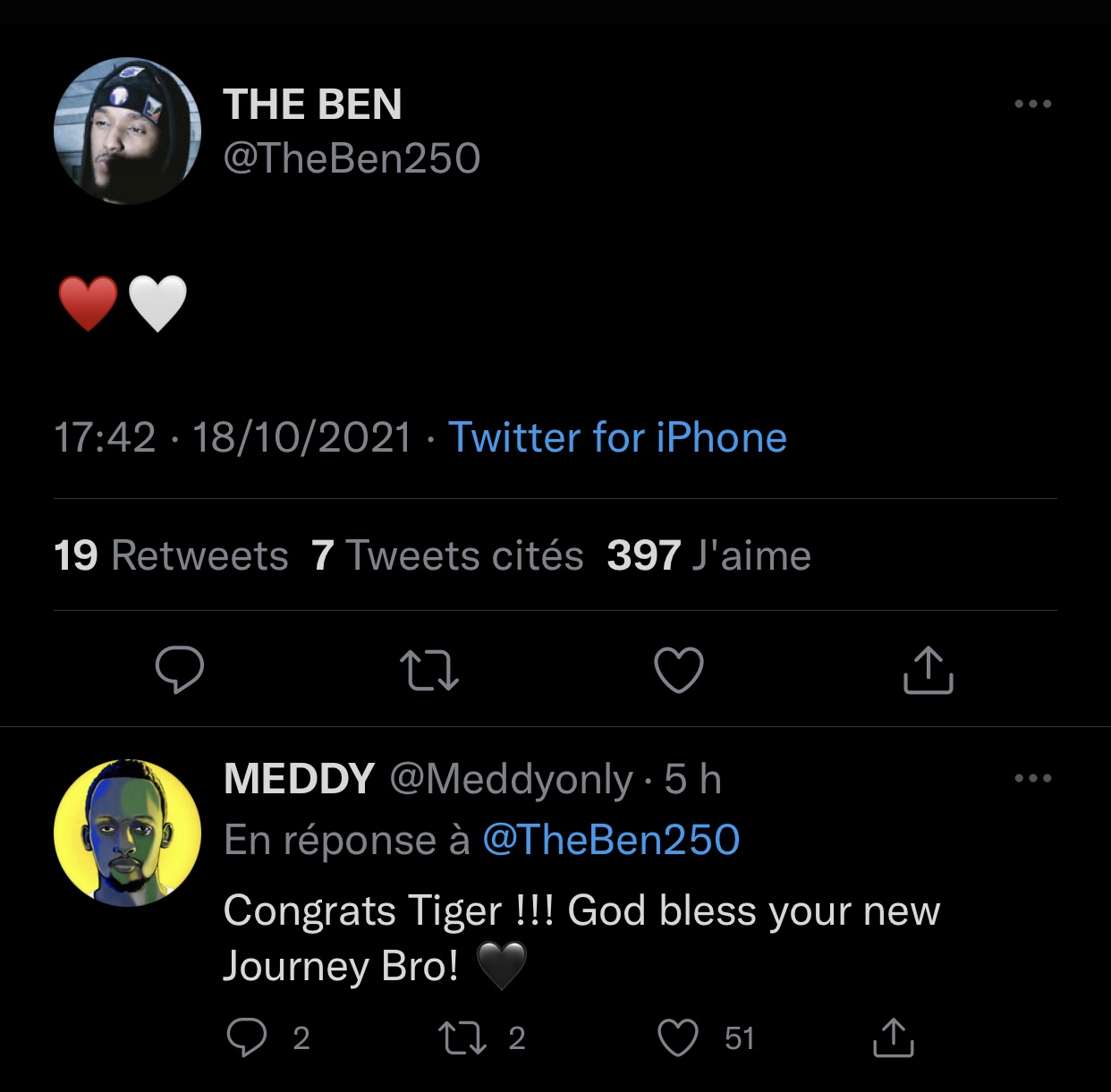 Umuhanzi Meddy, umwe mu bahanzi bakomeye hano mu Rwanda akaba n’inshuti ya The Ben, nawe ntiyatanzwe mu kwishimira iyi nkuru. Nyuma yuko The Ben yanditse kuri Twitter ye agira ati « ♥️🤍 », Meddy yahise amusubiza mu magambo agira ati « Congrats Tiger !!! God bless your new Journey Bro! 🖤 ».