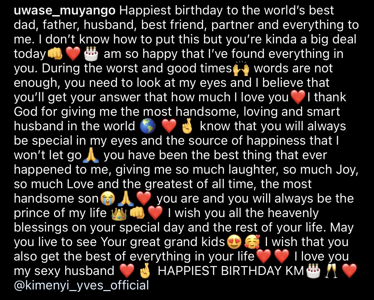 Kuri uyu wa 13 Ukwakira nibwo Kimenyi Yves yabonye izuba. Miss Uwase Muyango abinyujije ku rukuta rwe rwa instagram yifurije isabukuru nziza Kimenyi Yves agaruka ku kumushimira ko akomeje kumubera umugabo mwiza ndetse n’inshuti ye magara nziza. Yanamushimiy kandi kuba yaramuhaye umwana w’umuhungu ariwe Kimenyi Miguel Yanis maze aboneraho kumwifuriza isabukuru nziza anagaruka kuvuga ko azahora ari igikomangoma cy’umutima we.
