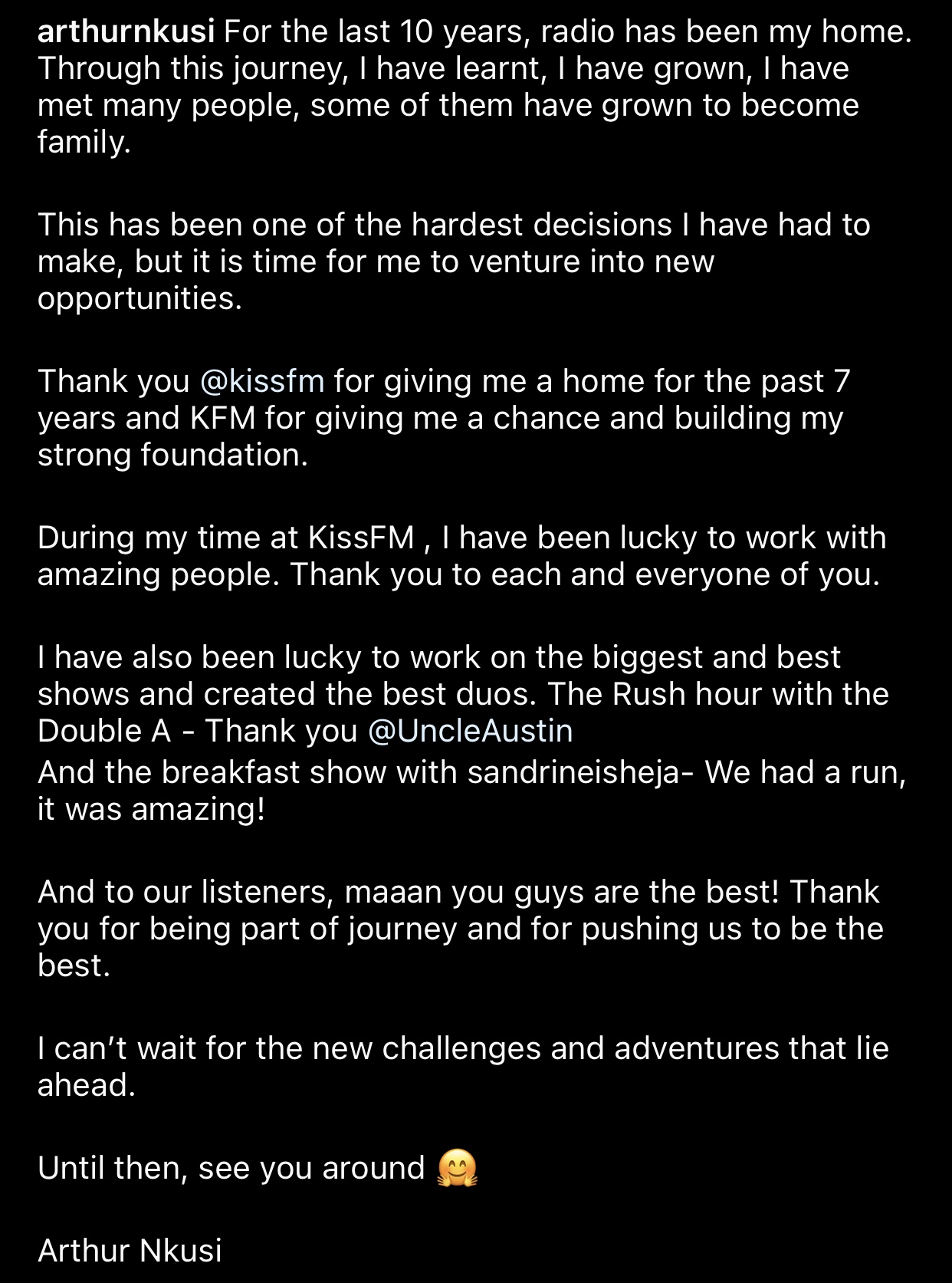 Abinyujije ku rukuta rwe rwa instagram, Nkusi Arthur yatangaje amagambo akurikira asezera ku banyamakuru bagenzi be ndetse n’abakunzi ba Radio 102.3 KISS FM muri rusange.