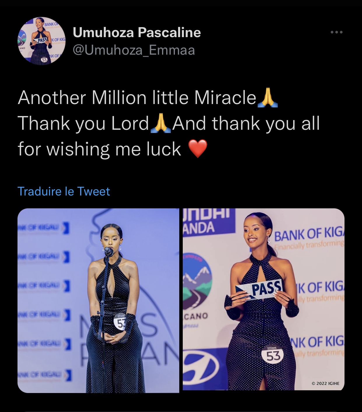 Umuhoza Emma Pascaline abinyujije ku rukuta rwe rwa Twitter yanditse amagambo yo gushimira. Yagize ati « Another Million little Miracle🙏
