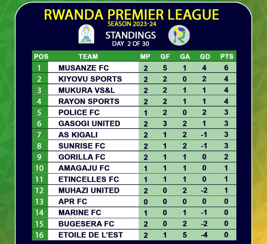 Ikipe ya Musanze FC niyo iyoboye urutonde rw’agateganyo rwa shampiyona y’u Rwanda aho ifite amanota 6 kuri 6 ikaba yizigamye ibitego bitatu ni mu gihe Kiyovu Sports iri ku mwanya wa kabiri ifite amanota ane inganya na Mukura ndetse na Rayon Sports iri ku mwanya wa kane.