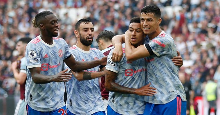 Manchester United's English midfielder Jesse Lingard (2nd R) celebrates with teammates after scoring their second goal during the English Premier League football match between West Ham United and Manchester United at The London Stadium, in east London on September 19, 2021. (Photo by Ian KINGTON / AFP) / RESTRICTED TO EDITORIAL USE. No use with unauthorized audio, video, data, fixture lists, club/league logos or 'live' services. Online in-match use limited to 120 images. An additional 40 images may be used in extra time. No video emulation. Social media in-match use limited to 120 images. An additional 40 images may be used in extra time. No use in betting publications, games or single club/league/player publications. /